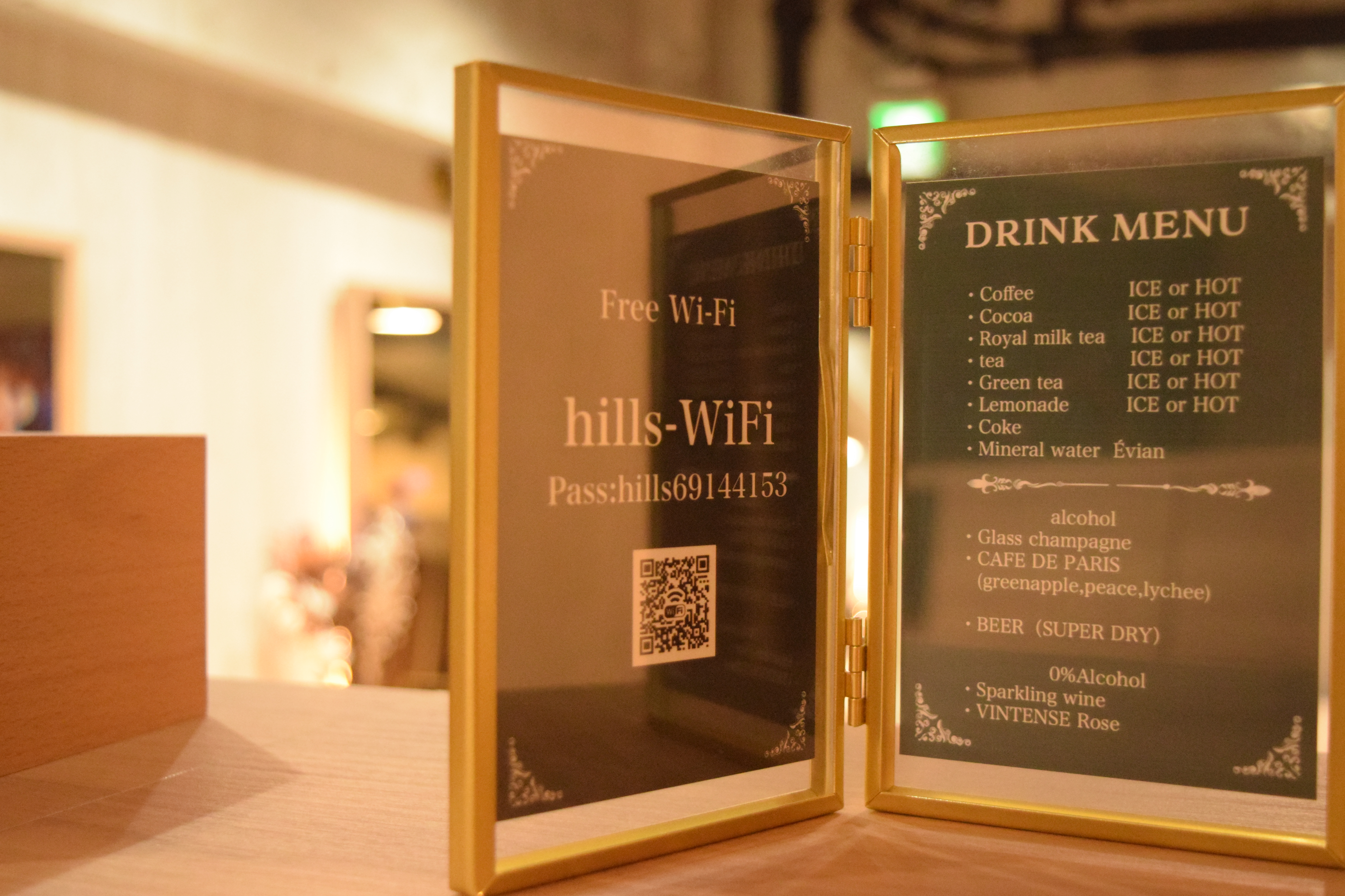 店内のWIFI完備は勿論の事、季節に合わせたお飲み物、又はアルコールやノンアルコール飲料もご用意しております。
